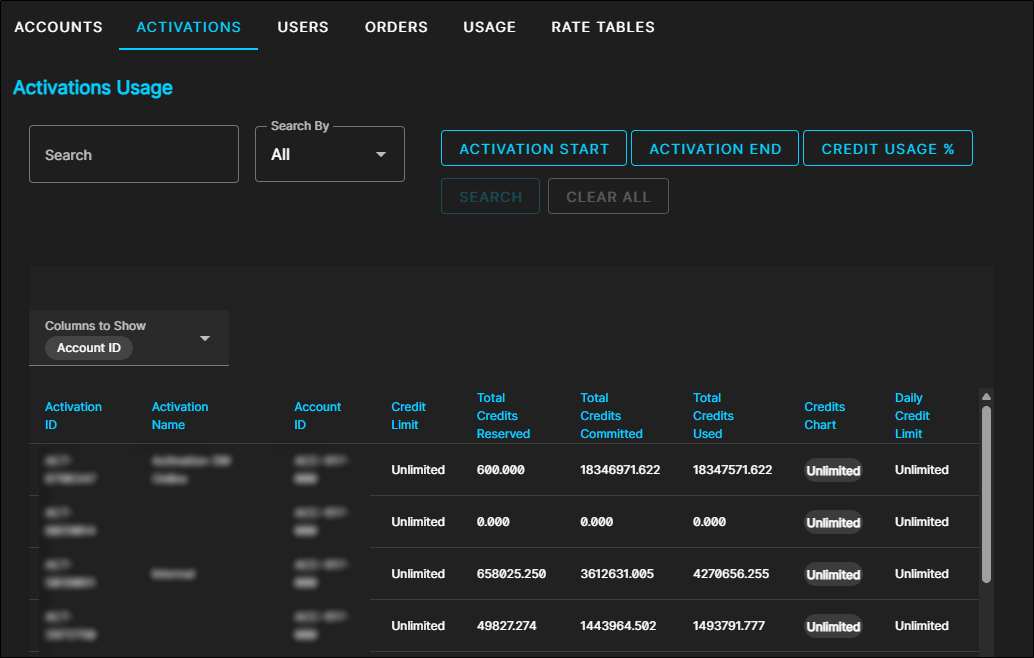 You can view usage by activation from the Usage page, on the Activations tab. The table shows the total number of credits used by each activation, and the number of users assigned to that activation. You will also see each activation's credit limit and a credits chart, which visualizes the percentage of the activation's credit limit that has been used. Use the search and filter tools to locate activations based on their activation ID, account ID, start/end dates, or other criteria.